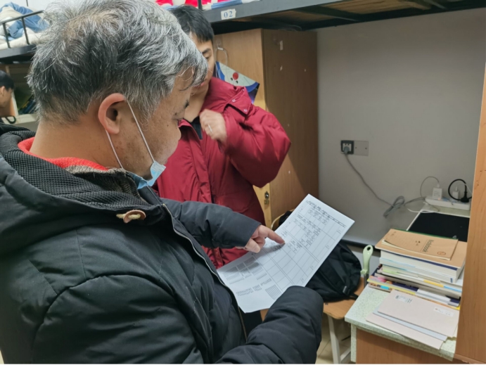 2月28日晚,信息学公司党委书记甘向阳、公司党委副书记徐丹带领全体学工办老师、班主任深入寝室看望员工。