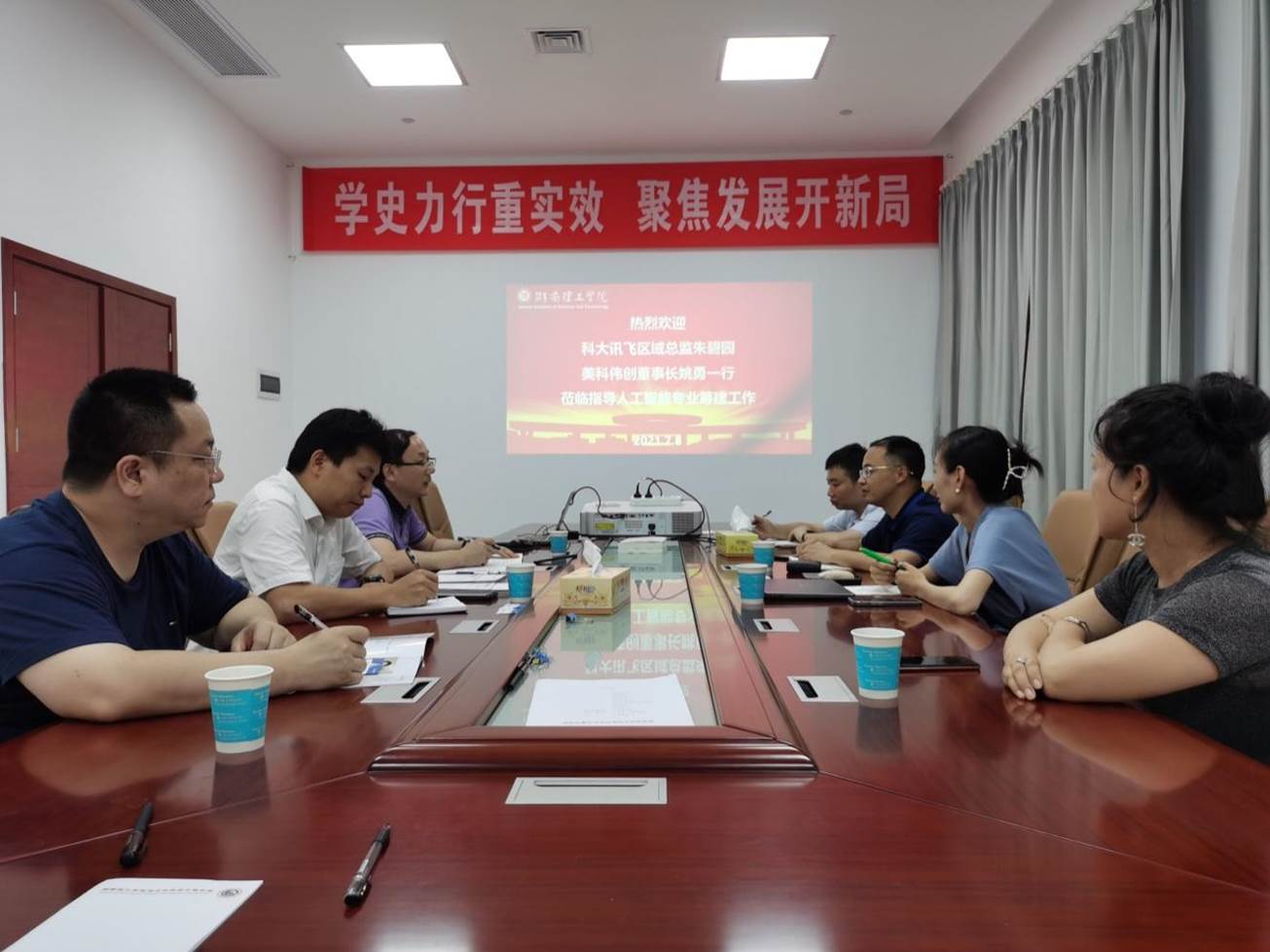 7月8日下午,意昂体育与科大讯飞在17517会议室召开人工智能专业筹建专题研讨会。经理童耀南、科大讯飞公司区域总监朱碧园、湖南美科伟创公司董事长姚勇等人参加。