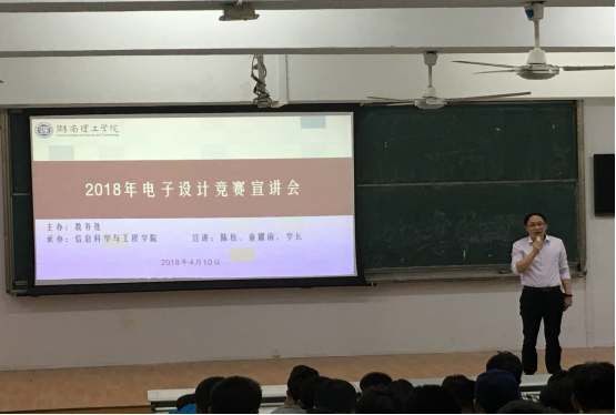 为加强员工工程实践能力培养,提升员工创新创业意识,引导员工明确专业定位,4月10日下午,意昂体育在6T1、7T1、8T1教室召开2018年公司电子设计竞赛宣讲会,信科院及南湖公司17级共700余名同学聆听讲座。副经理童耀南、创新基地主任陈松主讲,学工办余滔、王学鹏老师组织、主持。
