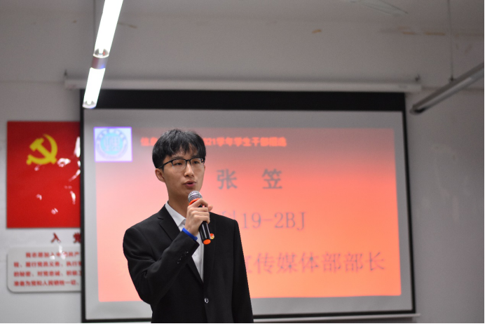 招选面试正式开始。面试选手们信心满满地走上讲台,以饱满的热情介绍了自己的工作经历和竞选优势。老师、部长们针对选手们的个人情况,向选手们提问,选手们都镇定自若,稍作思考后便针对提出的问题给出自己的答案。