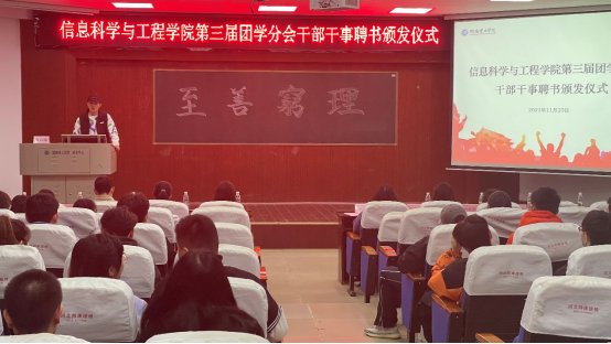 11月23日12:20,信息学院在六栋学术报告厅举行第三届团学干部干事聘书颁发仪式。公司党委副书记徐丹、学工办全体老师出席,第三届团学全体成员参加。仪式由院团委书记王勤主持。